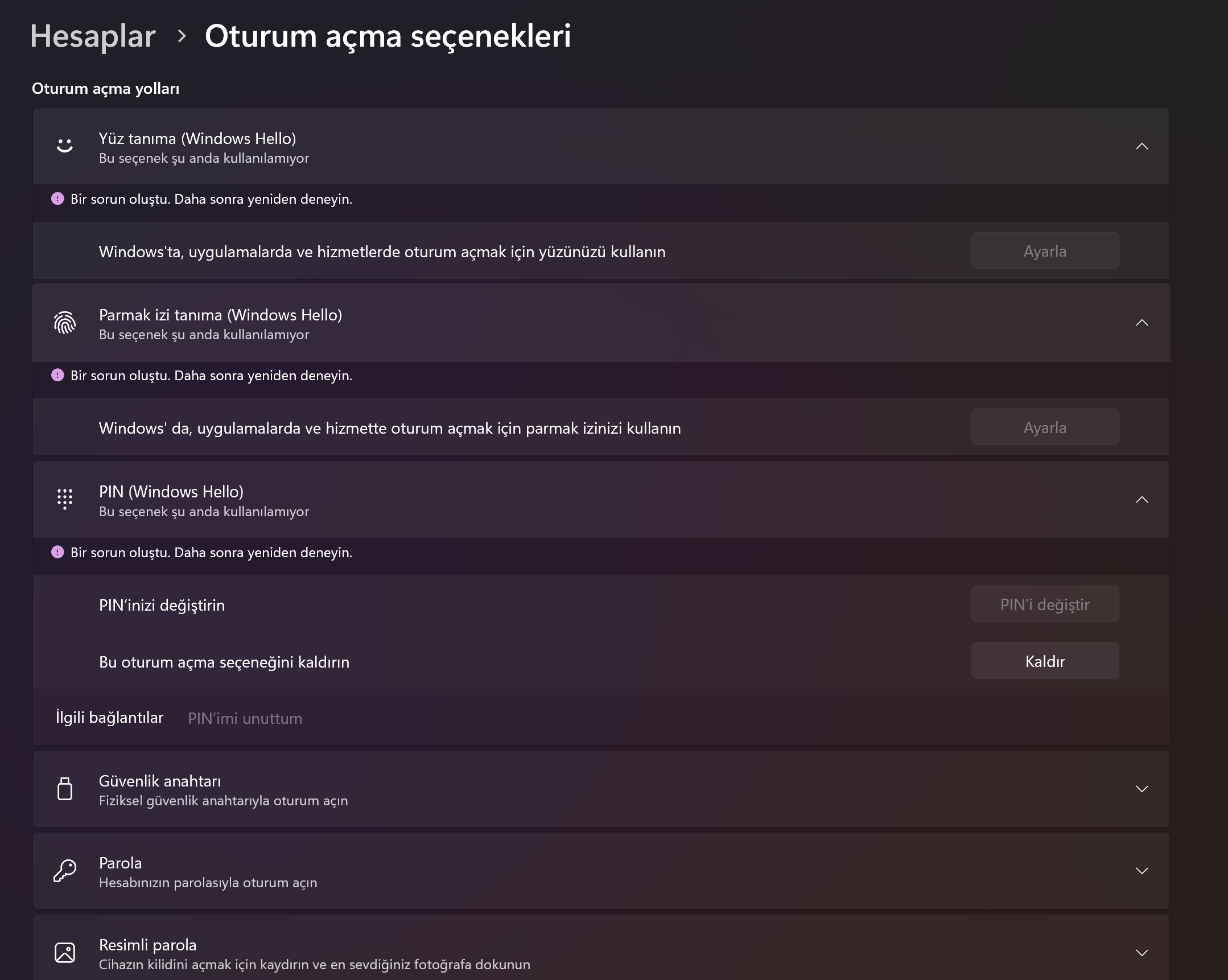 Okul hesabı, Windows Hello oturum açma seçeneklerini engelleyecek kısıtlamaları Windows'da otomatik olarak ayarlar; bu kısıtlamaları kaldırmak için şu adımları kullanmayı deneyin.