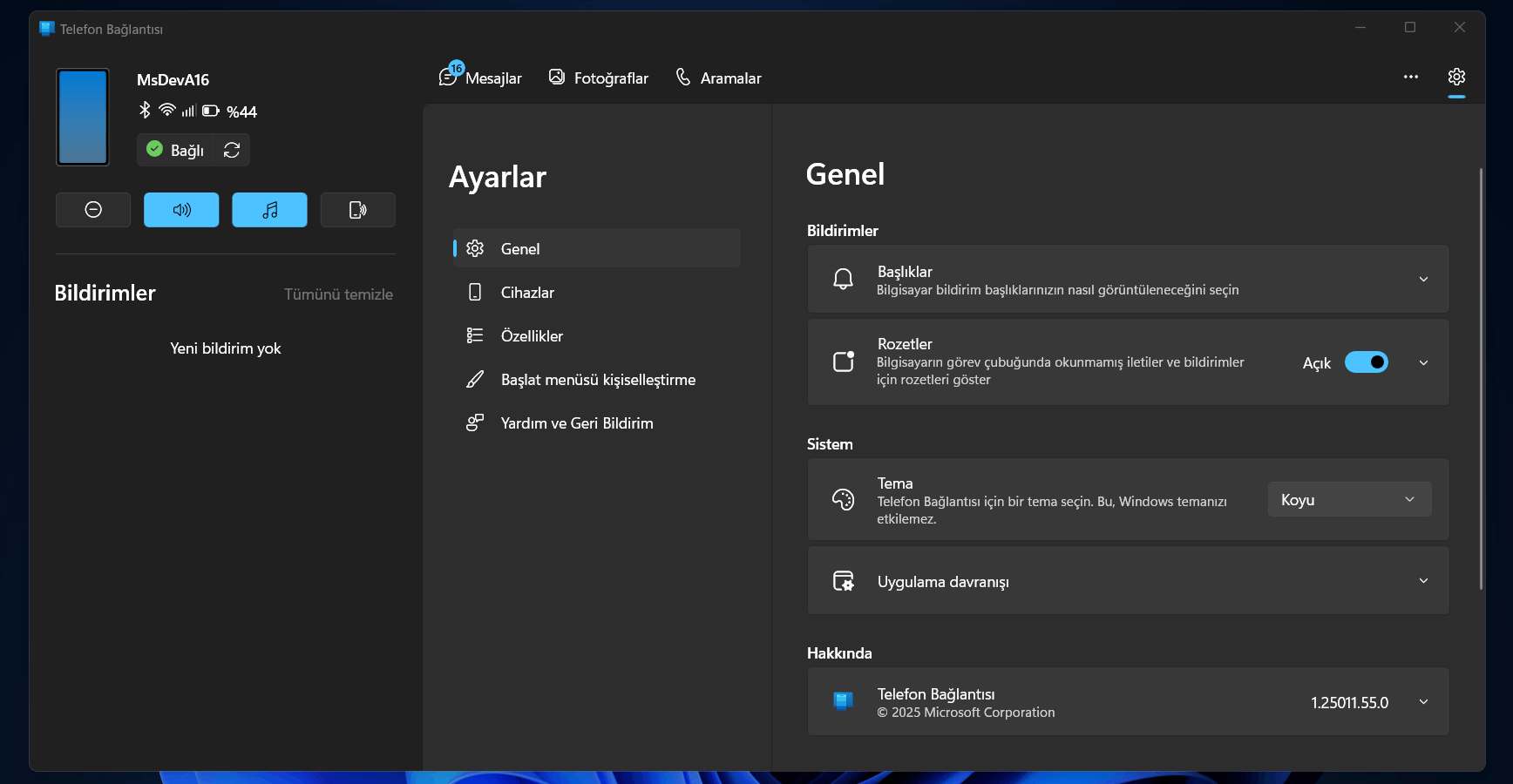 Mustafa Az önce uyumlu cihaz listesine baktım çünkü şüphem vardı. Samsung Galaxy A16, Phone Link uygulaması üzerinden ekran paylaşım özelliği için uyumlu değil.