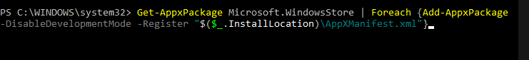Daha sonra, aşağıdaki metni PowerShell pencerelerinize kopyalayıp yapıştırın: " Get-AppxPackage Microsoft.WindowsStore | Foreach {Add-AppxPackage -DisableDevelopmentMode -Register "$($_.InstallLocation)\AppXManifest.xml"} " (birleştirilmiş ekran görüntüsüne bakın)