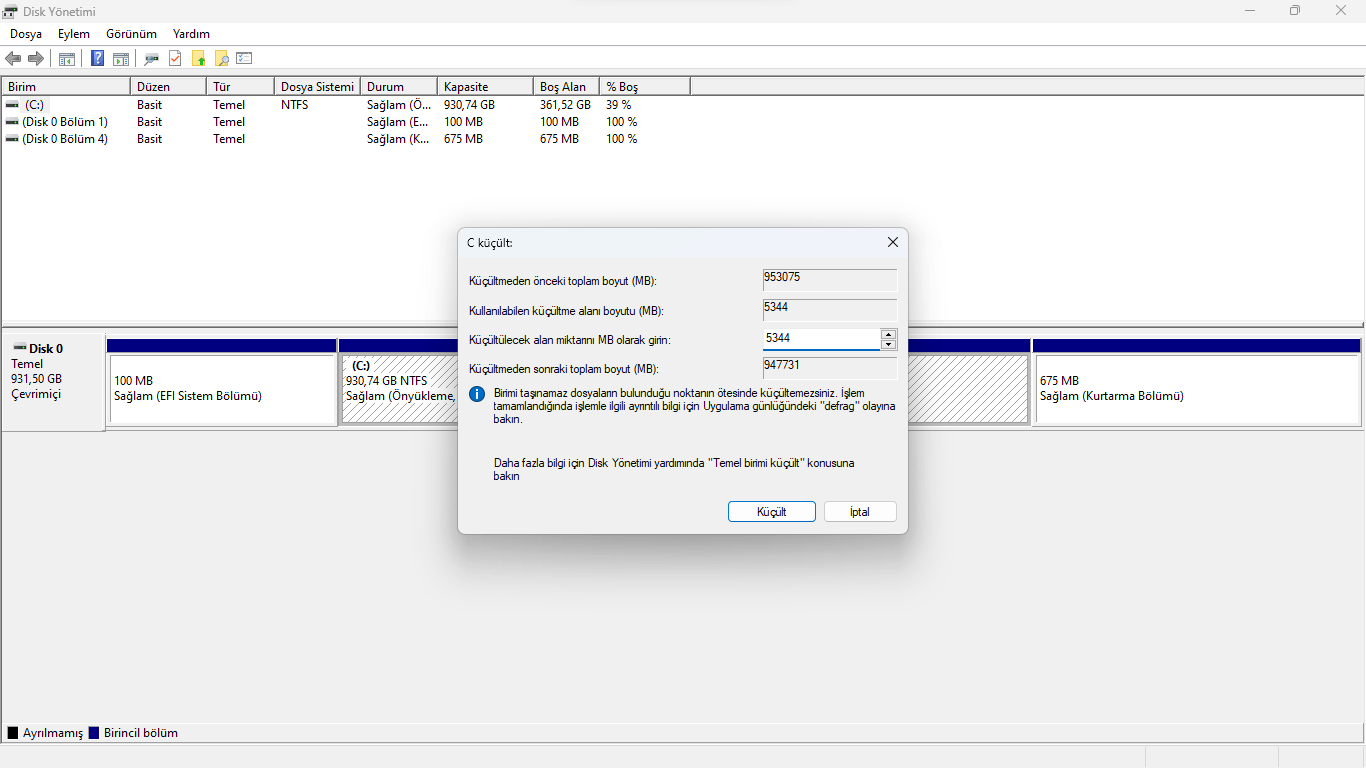 Taşınamayan dosyayı sürücünün başlangıcına taşıyabilecek olan bu sürücüyü birleştirmeyi deneyin ve ardından sürücüyü küçültebilirsiniz.