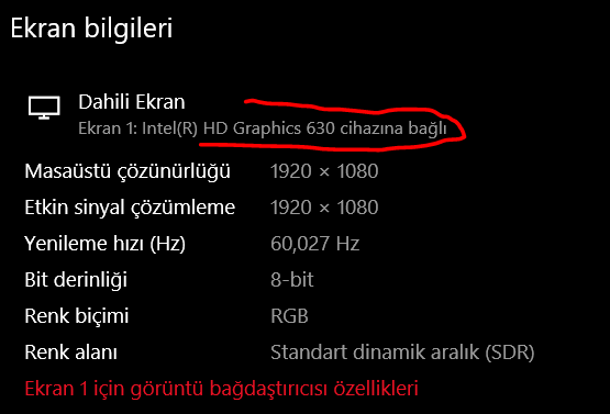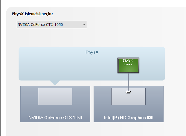 Merhaba Ömer, bununla ilgili olması mümkün. Tipik olarak, iki grafik kartına sahip dizüstü bilgisayarlar, güç tasarrufu sağlamak için hafif görevler için entegre GPU'yu (bu durumda, Intel HD 630) ve oyun veya video düzenleme gibi daha ağır görevler için özel GPU'yu (GTX 1050) kullanır.