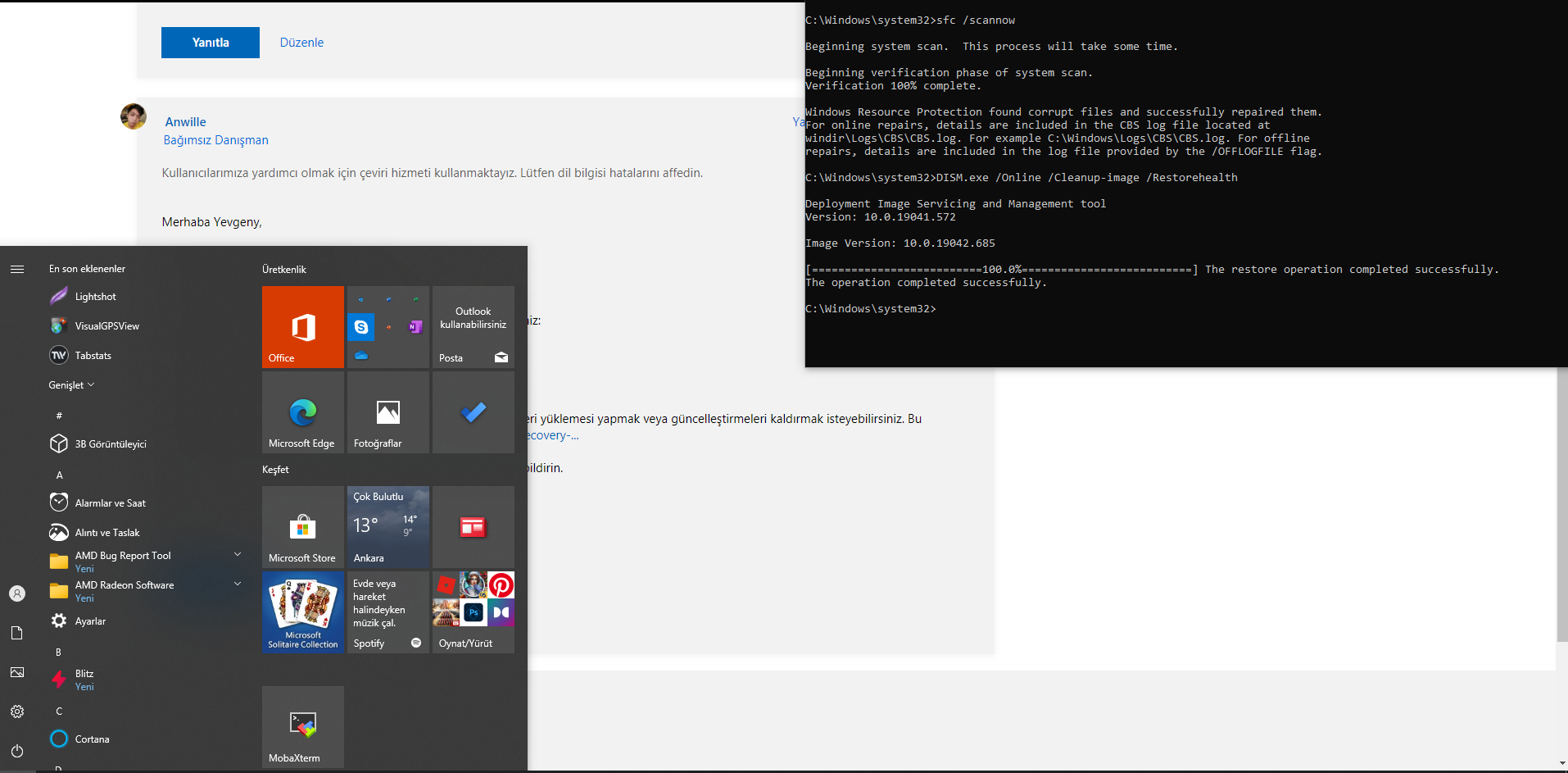Bozuk dosyaları taramaya sfc denetleyicisi çalıştırmayı deneyebilirsiniz: