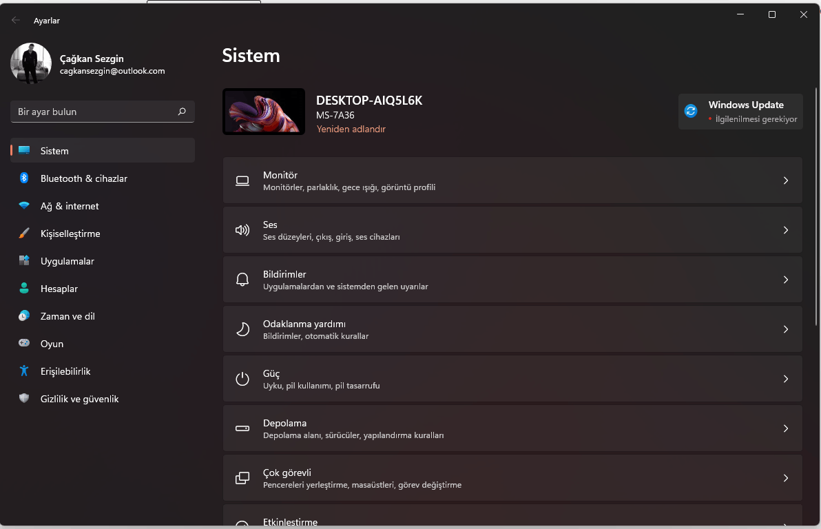 Ayarlar Uygulamasını açma (Başlat Menünüzde dişli simgesi)