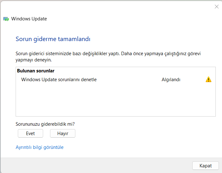 Küçük bir sorunum var. Öncelikle belirtmek isterim, Windows Update bileşiğinde herhangi bir sorun yoktur, güncellemeleri doğru düzgün şekilde alıyorum ve sorunsuz yüklüyorum. Sorun'un aşağı'ya görselini bıraktım. Çoğu çözüm yönetimi denedim başarısız oldu. Sorun şu size özetle anlatayım, Windows Update bileşinde bi sorun olmamasına rağmen, Windows Update Sorun Giderici aracını çalıştırdığım zaman aşağıdaki "Windows Update Sorunlarını Denetle-Algılandı⚠️" hatası'nı alıyorum. Bu uzun zamandır var bende herhangi bir çözüm yolu bulamadım. Sorunun Windows İşletim Sisteminde olduğunu düşünmeye başladım. Sizde bir yorumda bulunursanız sevinirim. Bunu kaale almalı mıyım? Yoksa normal bir Windows sorunu mu? Cevaplarınızı bekliyorum, teşekkür ederim.