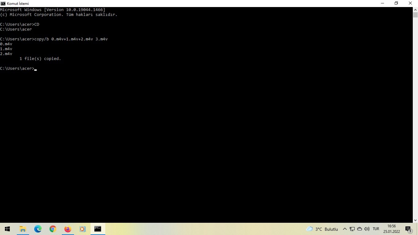 Windows 10'dan önceki sürümlerde, özellikle birkaç parçaya bölünen video dosyalarını komut istemi (CMD) aracılığıyla resimdeki şekilde birleştirebiliyordum.