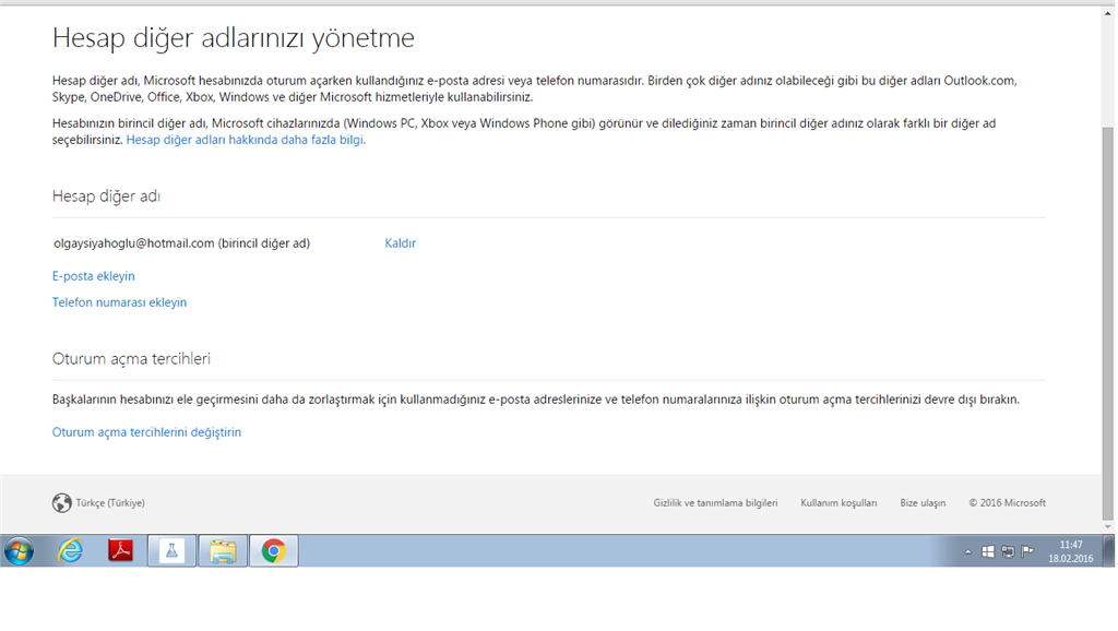 geçtikten sonra gelen sayfada, Resim 1.3'teki gibi Hesap diğer adıbaşlığı altında, eklediğiniz diğer adları yönetebilirsiniz.