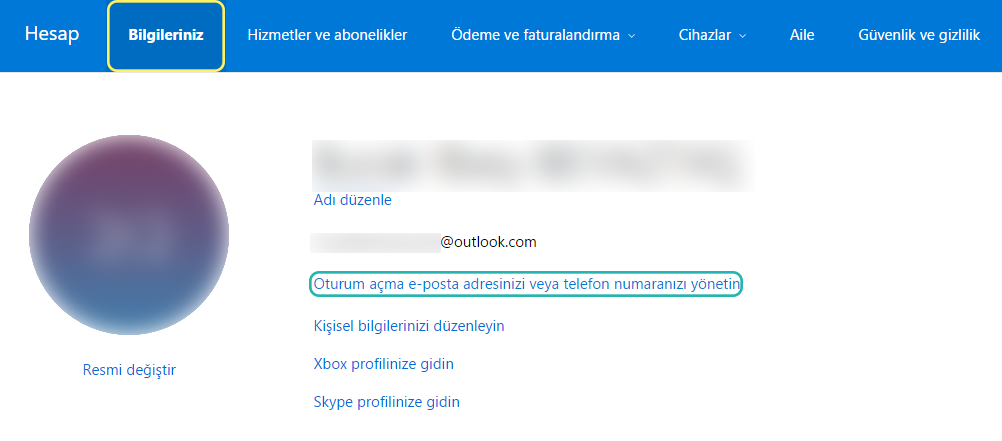 Resim 1.2'deki gibi Bilgileriniz sekmesini seçin. Oturum açma e-posta adresinizi veya telefon numaranızı yönetin'e tıklayın.