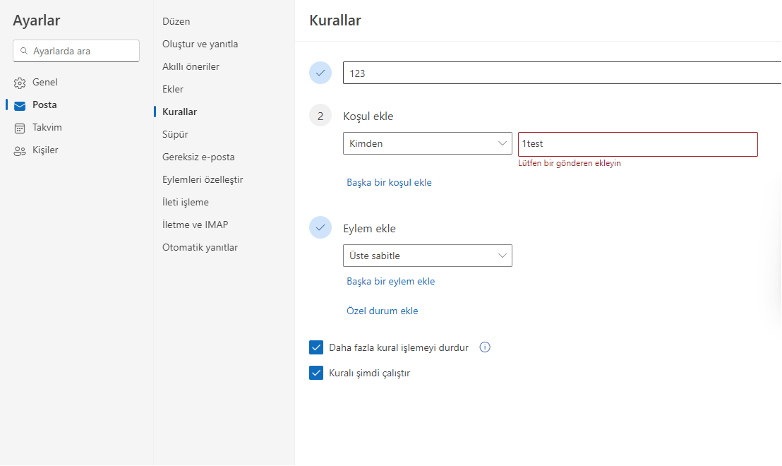 Posta kutunuz outlook olmayan posta kutusuysa, yine web terminalinde posta kutunuza giriş yapın ve kuralları ayarlayın. Mobil ile senkronize edilecektir.