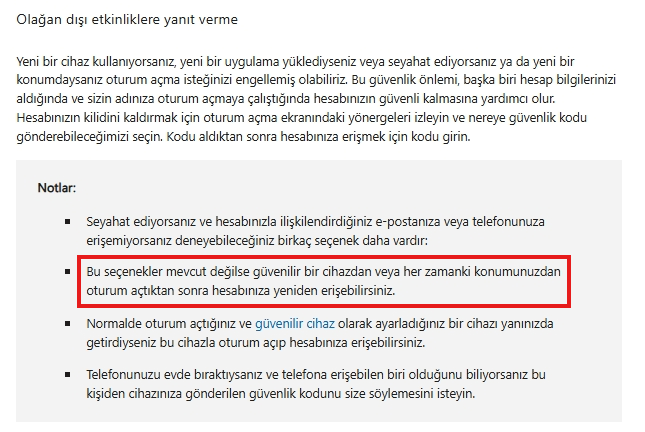 Hesabınıza yeni bir cihazdan veya yeni bir konumdan giriş yapıyorsanız, bu olağandışı bir etkinlik olarak kabul edilebilir ve hesabınıza başarılı bir şekilde erişmek için bir güvenlik kodu sağlamanız gerekebilir. Güvenlik kodunu sağlayamazsanız, yine de güvenilir bir cihazdan veya sık kullanılan bir konumdan oturum açabilirsiniz. Hesabınızda olağan dışı bir oturum açma etkinliği gerçekleştiğinde ne olur - Microsoft Desteği
