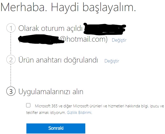 Ürün anahtarının doğrulanmasından sonra ürünü indirip yukarıdaki mailde verdiğim adımları izledim.
