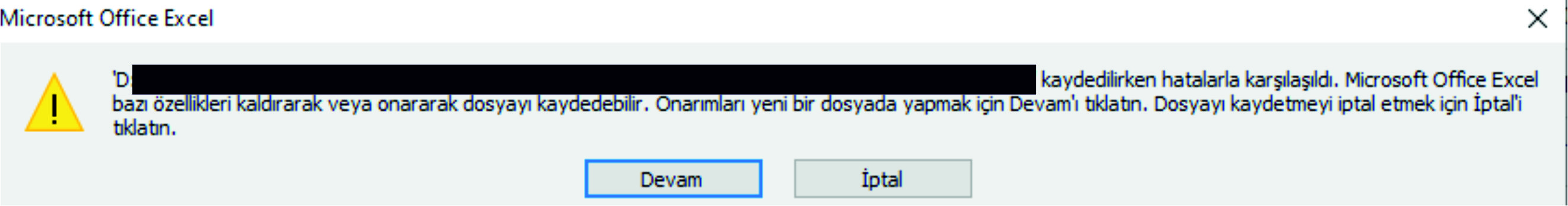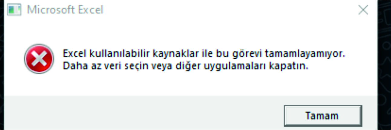 Excel dosyanızda çok fazla veri, formül, biçimlendirme varsa bu uyarıyı almanız normal. Dosyanızda çok değişiklik yaptıysanız ve onları kaybetmek istemiyorsanız, öncelikle bilgisayarınızda açık olan tüm uygulamaları kapatın (zaten uyarıda da bu yazıyor). Sonra kaydetmeyi tekrar deneyin. Verilerinizde değişiklik yapmadan bu uyarıyı alıyorsanız da bilgisayarı kapatıp açın ve sadece Excel uygulaması açıkken işlem yapın. İlk kaydetmenizde (belki) sorun yaşamazsınız, fakat yeni uygulamalar açıp kapattıkça bilgisayar kaynaklarınız yine yetersiz kalacak ve içeriği çok yüklü Excel dosyasını kaydetmek istediğinizde tekrar bu uyarıyı alacaksınız.
