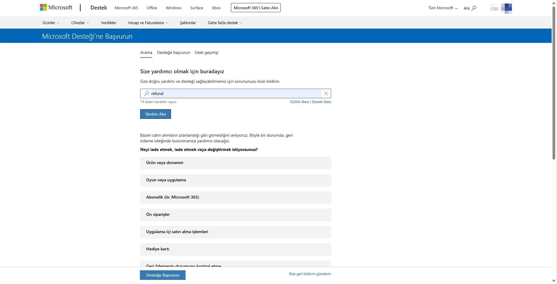 - Sorunuzun anahtar sözcüklerini arama kutusuna girin (örneğin, "abonelik/para iadesi") ve Yardım Al'ı seçin.