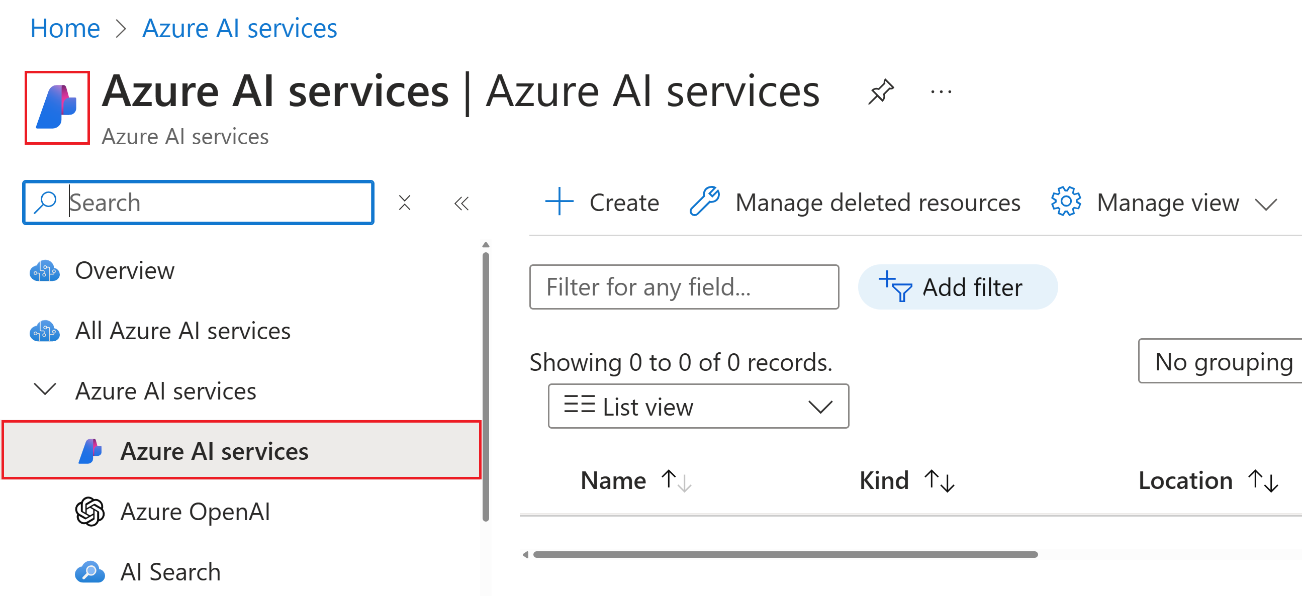 Azure, Döküm Araçları için birden fazla kaynak türü sağlar. ile bir tane oluşturduğunuzdan kindAIServicesemin olun.