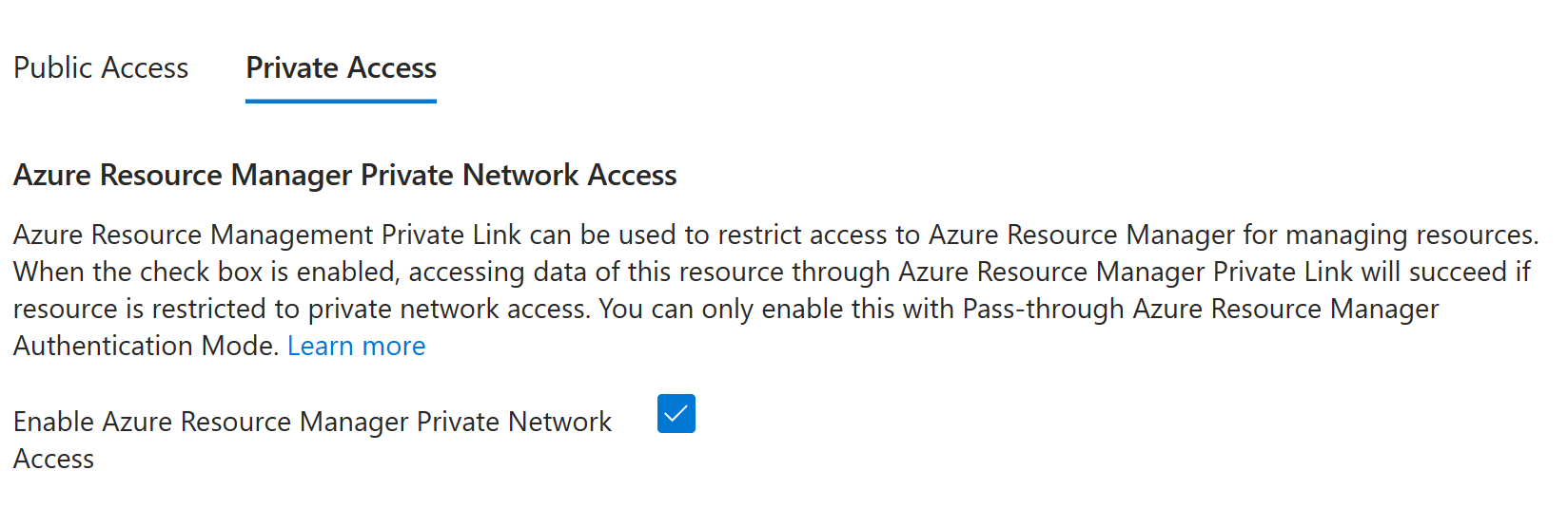 Azure Resource Manager özel ağ erişimini yalnızca Geçişli kimlik doğrulama modunu kullandığınızda etkinleştirebilirsiniz.