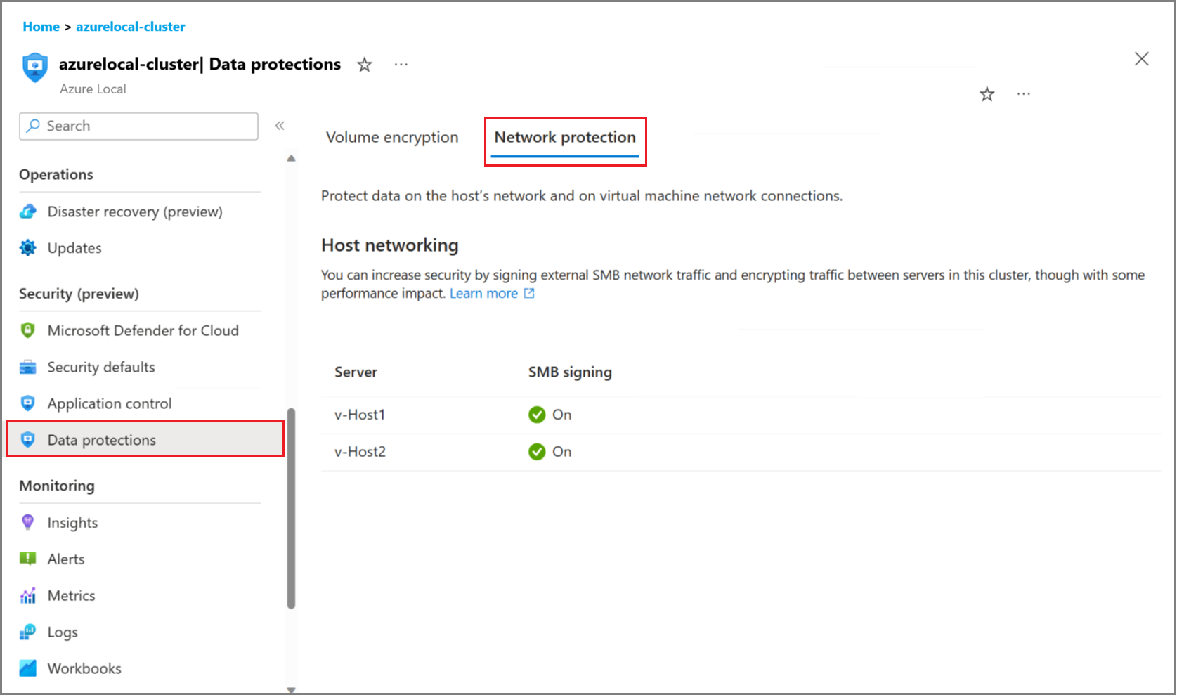 Veri korumaları>Ağ koruması sekmesinde SMB imzalama durumunu görüntüleyin. SMB imzalama, Azure Yerel örneğiyle diğer sistemler arasında SMB trafiğini dijital olarak imzalamanıza olanak tanır.