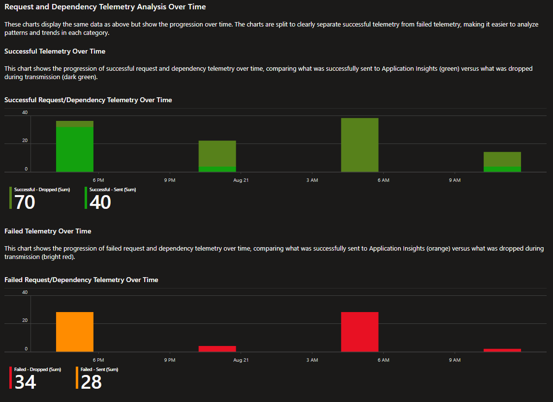 successdeğerine göre böler, sonra da Ayrı çubuk grafiklerde Gönderilmiş ve Bırakılan grafiklerini gösterir:- Başarılı ve gönderildi ve bırakıldı. Bu grafik, uygulamanın başarılı olarak kaydettiği istek ve bağımlılık öğelerini gösterir. Grafik, veri ihracatçısının Application Insights'a gönderdiği öğeleri, veri ihracatçısının bıraktığı öğelerle karşılaştırır.