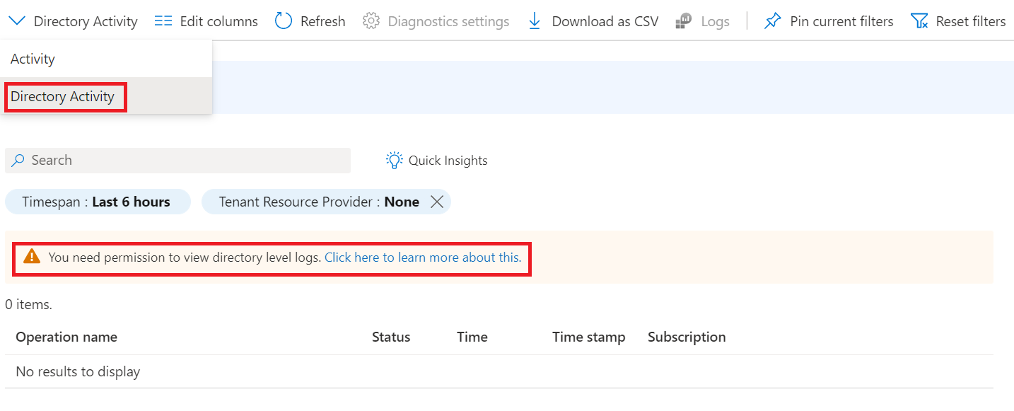 - Select Directory Activity. If you see a message stating You need permission to view directory-level logs, select the link to learn how to get permissions.