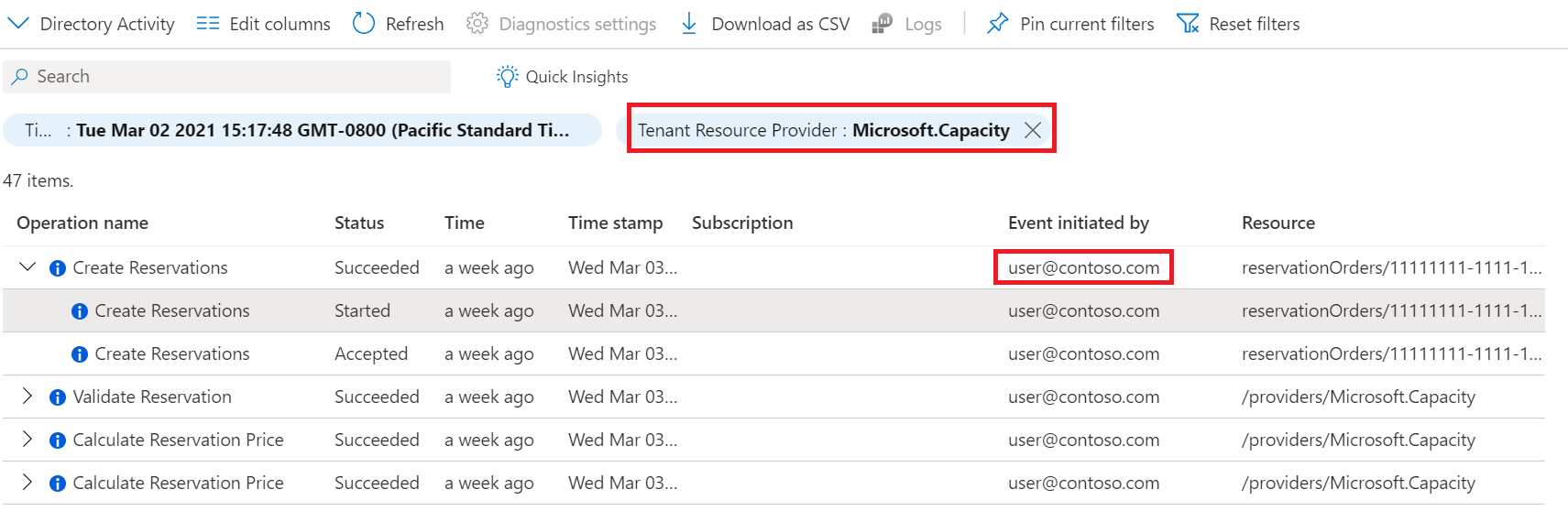 - Once you have permission, filter Tenant Resource Provider with Microsoft.Capacity. You should see all reservation-related events for the selected time span. If needed, change the time span.