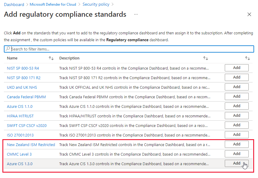 Mevzuat uyumluluğu panosu şu ana kadar dört yerleşik standardı desteklemiştir: Azure CIS 1.1.0, PCI-DSS, ISO 27001 ve SOC-TSP. Desteklenen ek standartların genel önizleme sürümünü duyuruyoruz: NIST SP 800-53 R4, SWIFT CSP CSCF v2020, Kanada Federal PBMM ve UK Official ile birlikte UK NHS. Ayrıca Azure CIS 1.1.0'ın standarttan daha fazla denetimi kapsayan ve genişletilebilirliği geliştiren güncelleştirilmiş bir sürümünü de yayınlıyoruz.