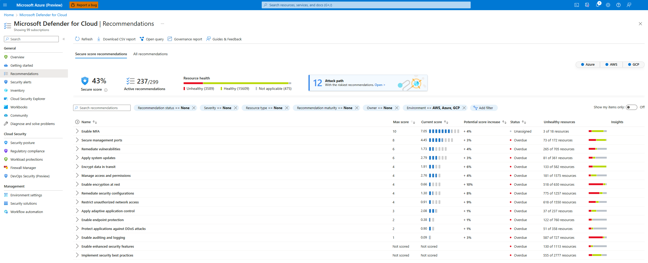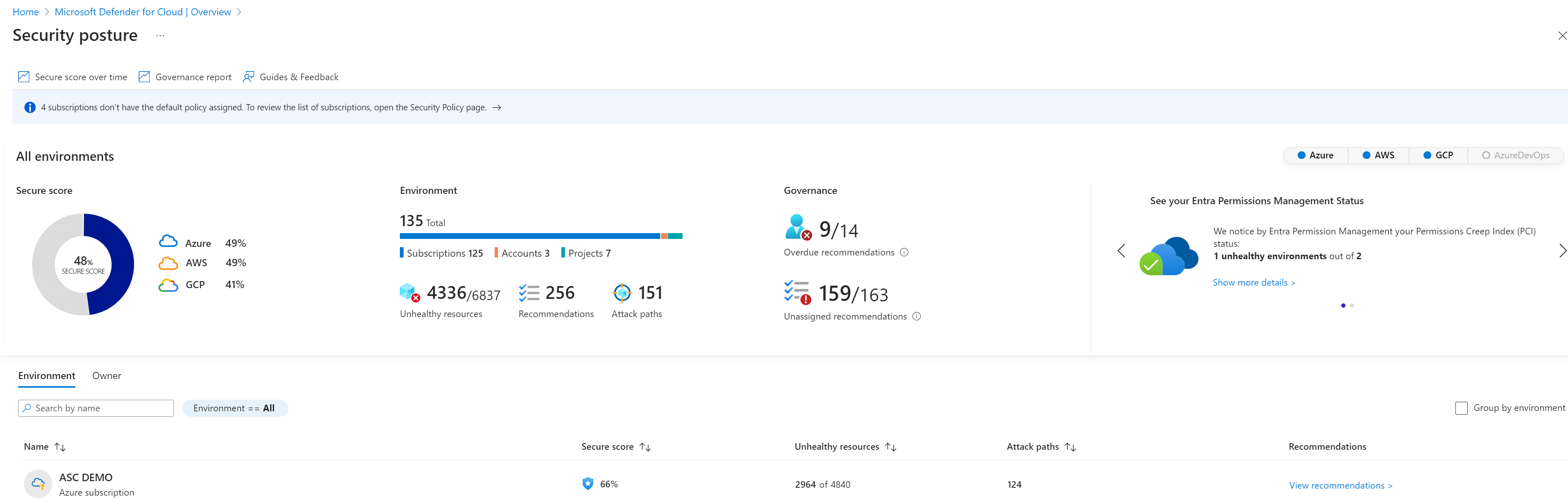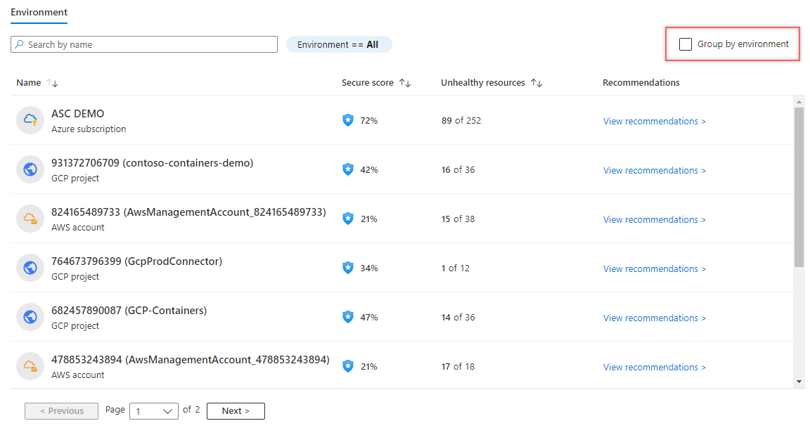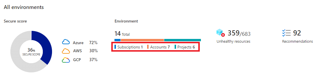 Bu sayfada, genel puanınızı etkileyen abonelikleri, hesapları ve projeleri, iyi durumda olmayan kaynaklar hakkındaki bilgileri ve ilgili önerileri görebilirsiniz. Azure, Amazon Web Services (AWS), Google Cloud Platform (GCP) ve Azure DevOps gibi ortama göre filtreleyebilirsiniz. Ardından her Azure aboneliği, AWS hesabı ve GCP projesinde detaya gidebilirsiniz.