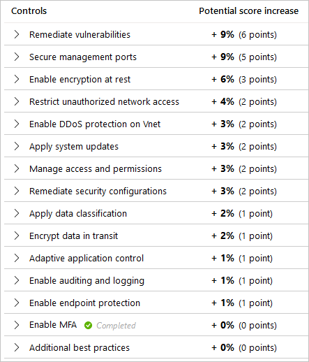 Bir güvenlik denetimi için tüm olası noktaları almak için tüm kaynaklarınızın güvenlik denetimindeki tüm güvenlik önerilerine uyması gerekir. Örneğin, Bulut için Defender yönetim bağlantı noktalarınızın güvenliğini sağlamak için birden çok öneri sunar. Güvenlik puanınızda bir fark oluşturmak için bunların tümünü düzeltmeniz gerekir.