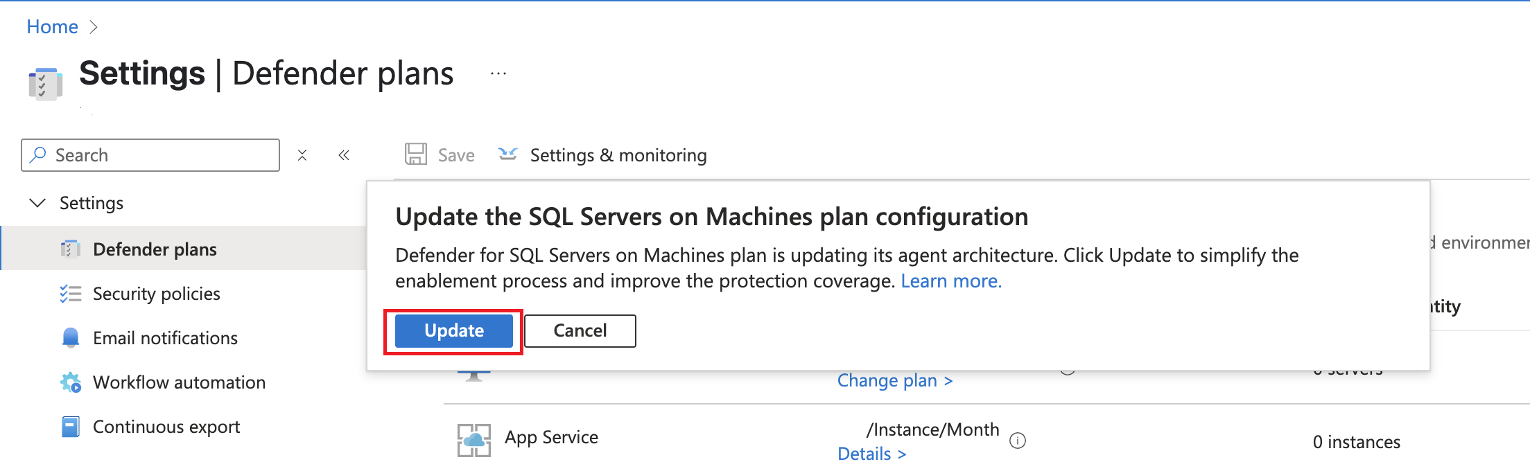Makinelerde SQL Server'lar için Defender planı, ekleme işlemini basitleştiren ve SQL korumasını geliştiren güncelleştirilmiş bir aracı mimarisi içerir. Görünürlük elde etmek ve koruma sağlamak için plan, her SQL server örneğinin Azure'a kaydedilmesini gerektirir.