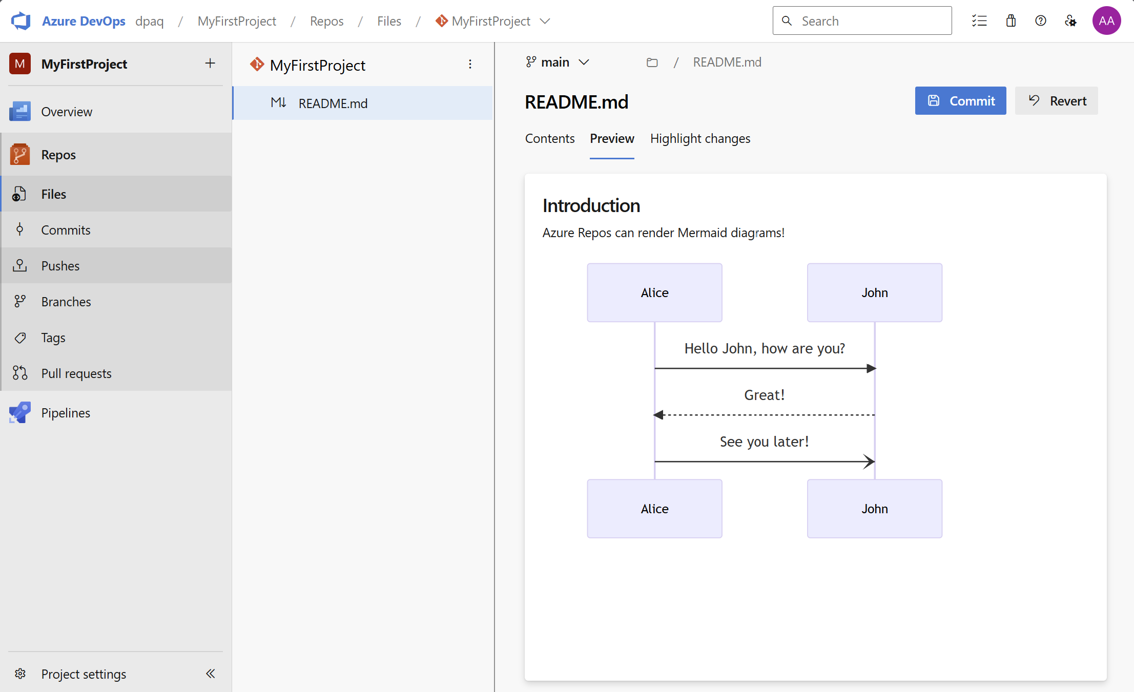 Ayrıca Azure Repos'ta mermaid söz dizimine sahip markdown dosyalarının artık dosya önizlemelerinde ve çekme isteklerinde diyagram olarak işlenip belgeleriniz için daha net görseller sunacağını duyurmaktan heyecan duyuyoruz.