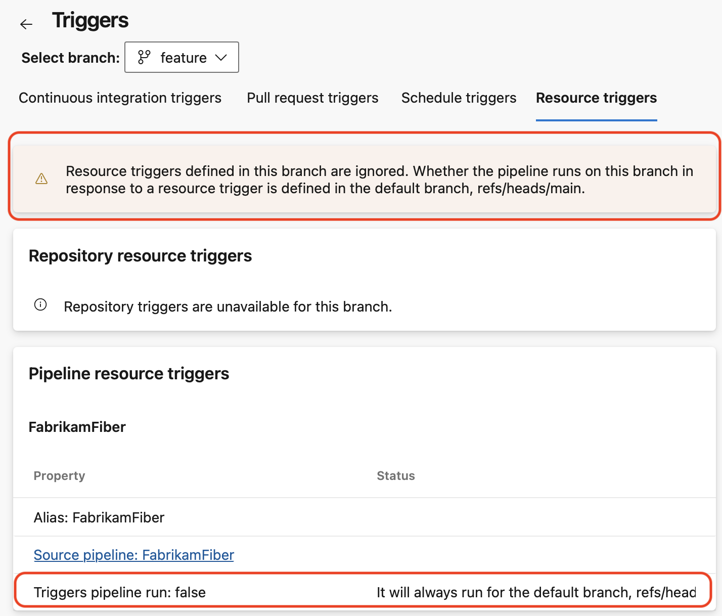 Kaynak tetikleyicileri sekmesinde, varsayılan dalda olmadığında, bu dal için tanımlanan tetikleyicilerin yoksayıldığını belirten bir uyarı alırsınız.
