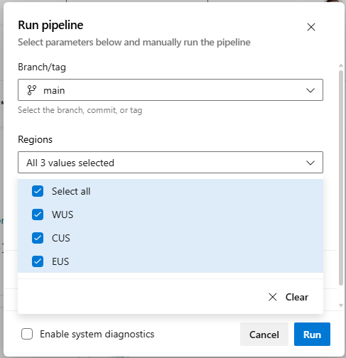 Bu işlem hattını kuyruğa alırken, aşağıdaki ekran görüntüsünde gösterildiği gibi, dağıtılacak birden çok bölgeyi seçme seçeneğiniz vardır.