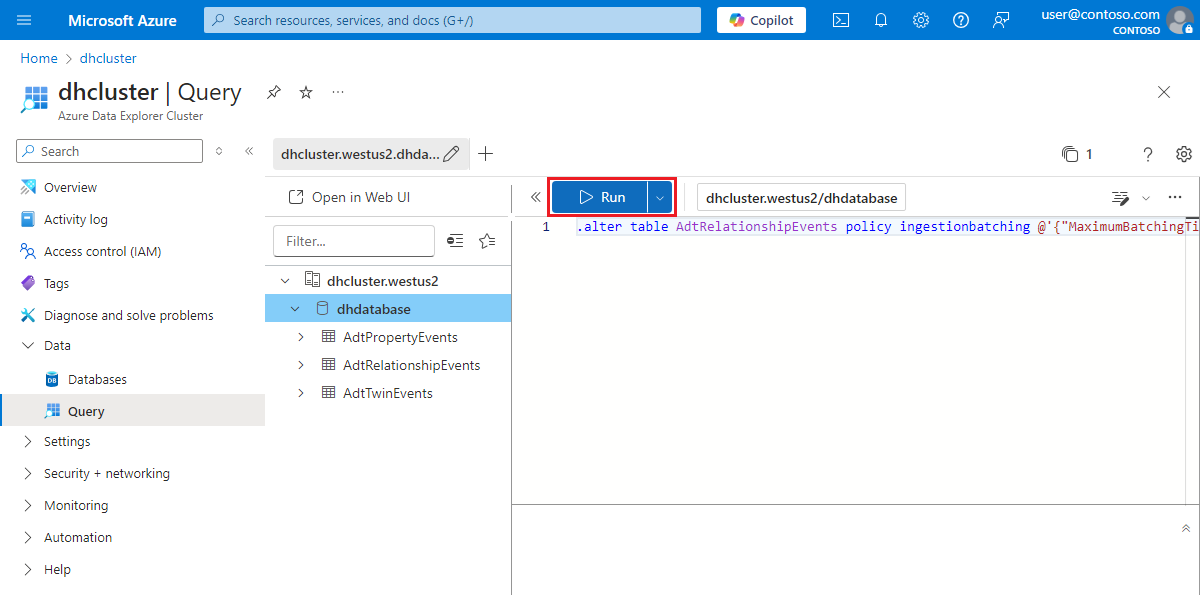 Bu komut ayrıca sırasıyla ikiz özellik güncelleştirmelerini, ilişki yaşam döngüsü olaylarını ve ikiz yaşam döngüsü olaylarını depolamak için Azure Veri Gezgini veritabanınızda üç tablo oluşturur. Bu tür geçmişe geçmiş veriler ve bunlara karşılık gelen Azure Veri Gezgini tabloları hakkında daha fazla bilgi için bkz. Veri türleri ve şemalar.