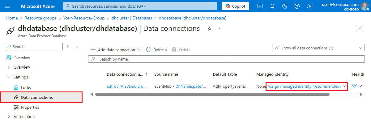 - Azure Veri Gezgini veritabanı için veri bağlantısını sistem tarafından atanan yönetilen kimliği kullanacak şekilde güncelleştirin. Azure portalında, Azure Veri Gezgini kümesine gidip menüdeki Veritabanları'nı kullanarak veri geçmişi veritabanına giderek veri bağlantısını güncelleştirebilirsiniz. Veritabanı menüsünde Veri bağlantıları'nı seçin. Veri geçmişi bağlantınızın tablo girişinde, Sistem tarafından atanan seçeneğini belirleyebileceğiniz Yönetilen kimlik ata seçeneğini görmeniz gerekir.