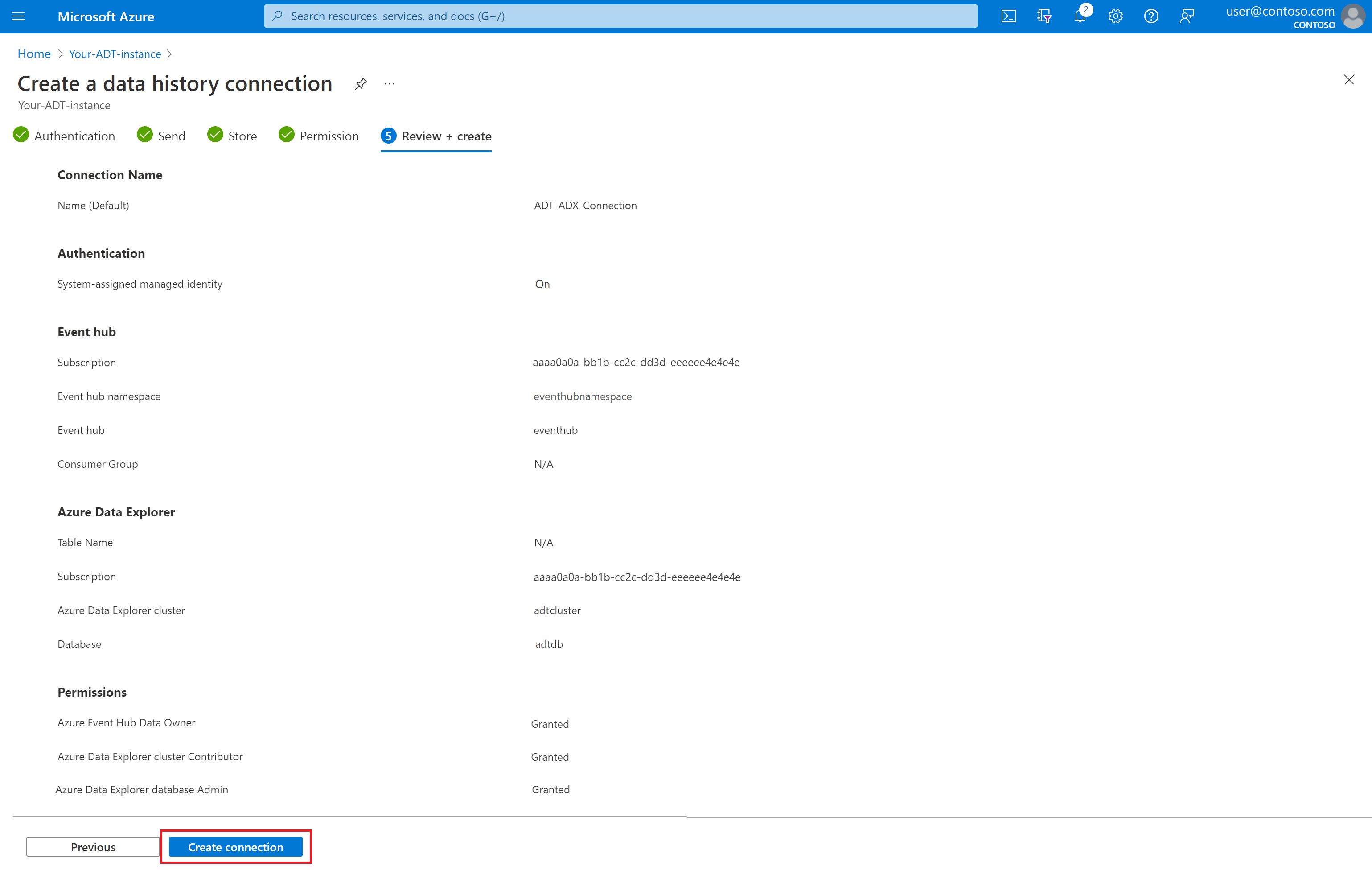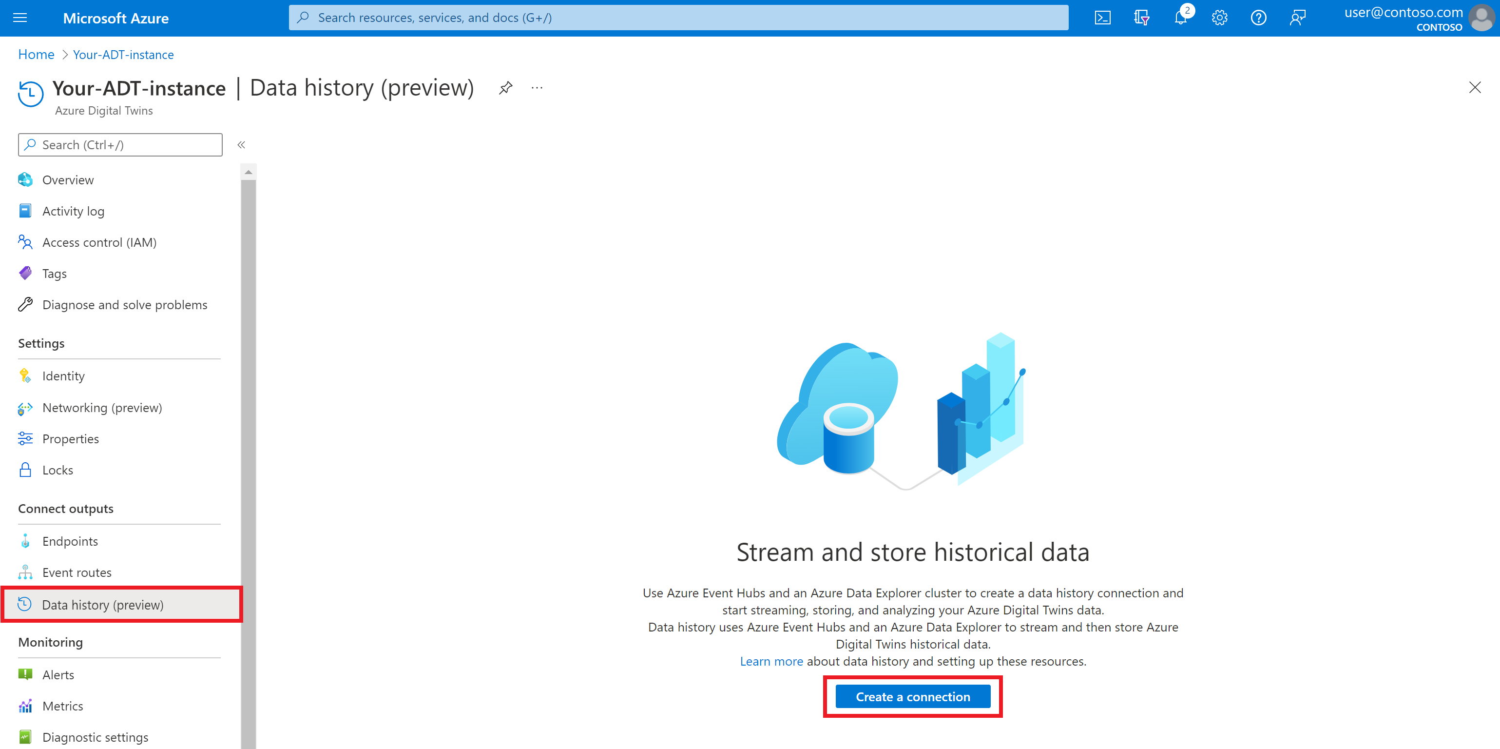 Gerekli kaynakları oluşturduğunuza göre bu bölümdeki komutunu kullanarak Azure Digital Twins örneği, olay hub'ı ve Azure Veri Gezgini kümesi arasında bir veri geçmişi bağlantısı oluşturun.