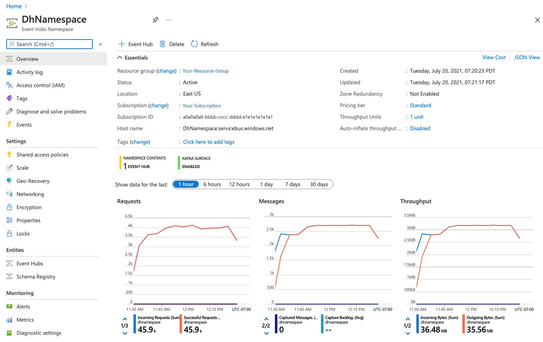 Azure Veri Gezgini'nde veri görmüyorsanız, geçmişe alma veri akışı düzgün çalışmıyor demektir. Event Hubs ad alanınızı Azure portalında görüntüleyerek sorunu araştırabilirsiniz. Portal, ad alanına ve ad alanından çıkan ileti akışını gösteren grafikler görüntüler. Bu görüntü, akışın hangi bölümünün çalışmadığını belirlemenize yardımcı olmak için hem Azure Digital Twins'den gelen iletilerin akışını hem de Azure Veri Gezgini'ne giden iletileri doğrulamanızı sağlar.