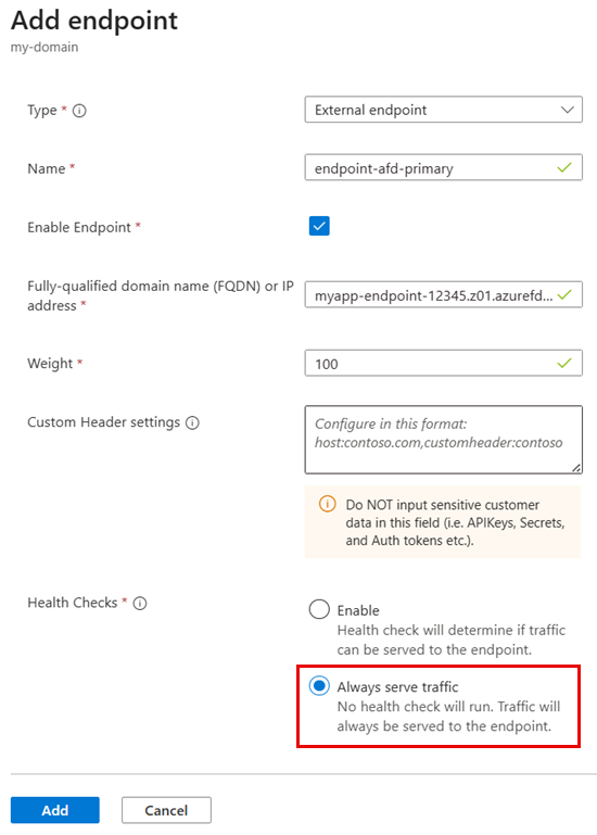 Host=$CUSTOM_DOMAIN(Azure Front Door'un doğru özel etki alanına yönlendirmesi için gereklidir)Sistem Durumu Denetimleri: Her zaman trafiğe hizmet sunma (sistem durumu denetimlerini devre dışı bırakma)