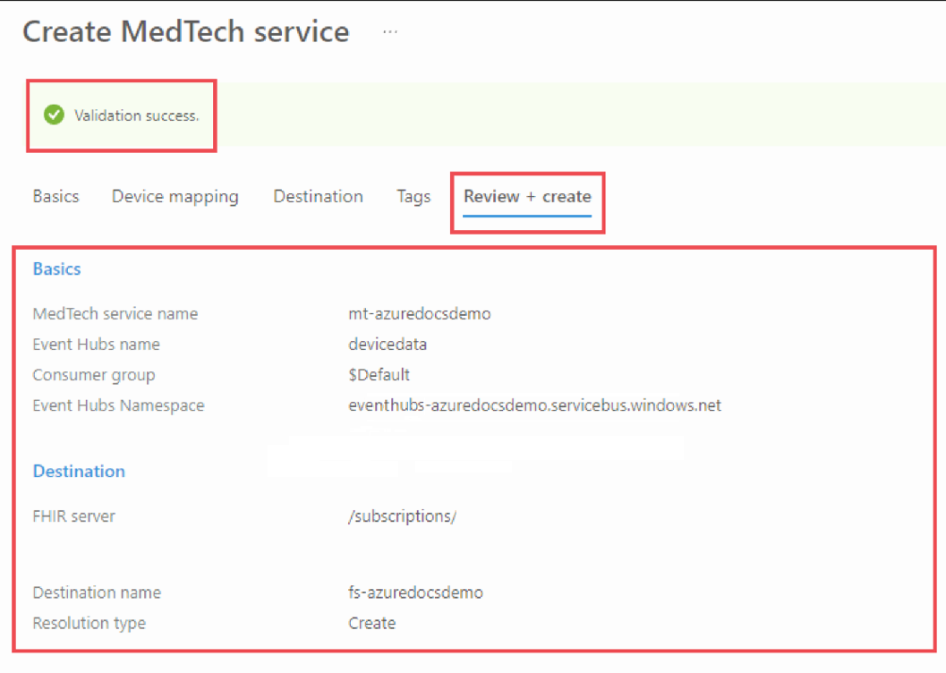 MedTech hizmeti dağıtımınızın doğrulama işlemine başlamak için Gözden Geçir ve oluştur sekmesini seçin. Kısa bir gecikme olur ve doğrulama başarılı iletisini gösteren bir ekran görmeniz gerekir.