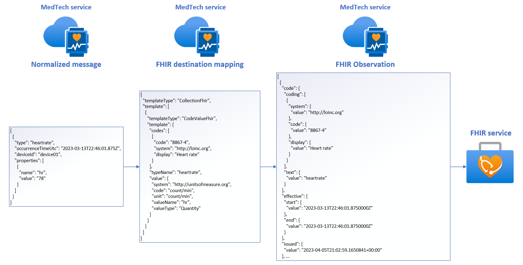 MedTech hizmetinin FHIR hizmetinde kalıcılık için cihaz ileti verilerini FHIR Gözlemlerine nasıl işlediği hakkında daha fazla bilgi için bkz. MedTech hizmeti cihaz ileti işleme aşamalarına genel bakış.