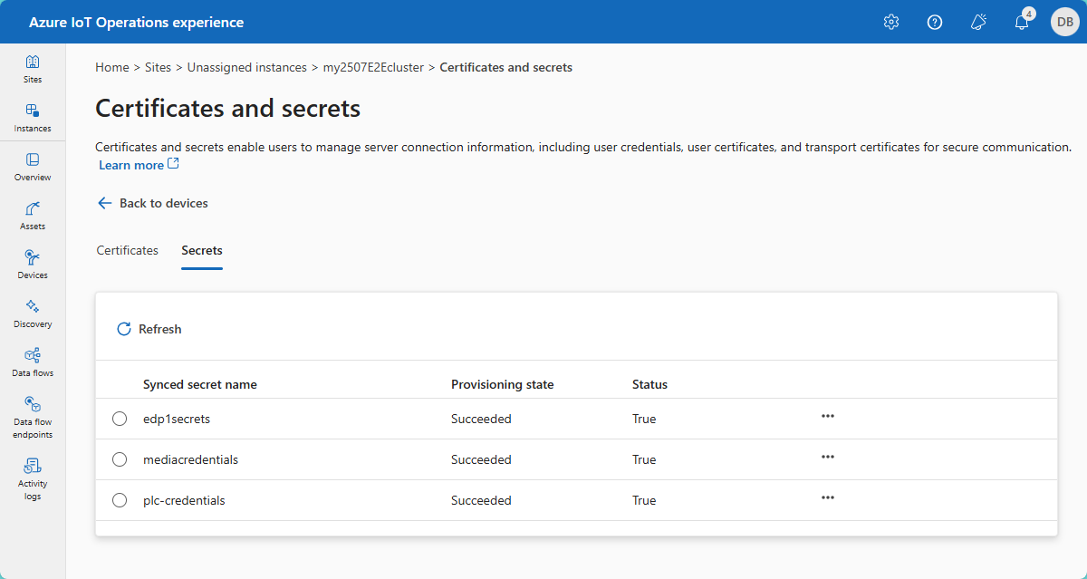 Kubernetes kümenizdeki SecretProviderClass ve SecretSync özel kaynaklarını doğrudan düzenlemek, Azure IoT İşlemleri'nde gizli dizi akışını bozabilir. Gizli bilgilerle ilgili tüm işlemler için işlemler deneyimi web arabirimini kullanın.
