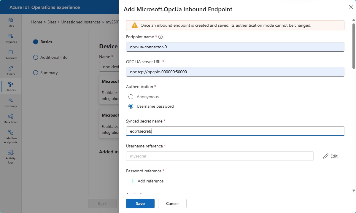 Gizli dizi yönetimi adımlarını ayarladıktan sonra Azure Key Vault'a gizli diziler ekleyebilir ve bunları işlem deneyimi web kullanıcı arabirimini kullanarak Cihaz gelen uç noktaları veya Veri akışı uç noktaları'nda kullanılacak Kubernetes kümesiyle eşitleyebilirsiniz. Gizli diziler genellikle dış sistemlerde kimlik doğrulaması için gereken kullanıcı adları, parolalar, sertifikalar veya özel anahtarlardır.