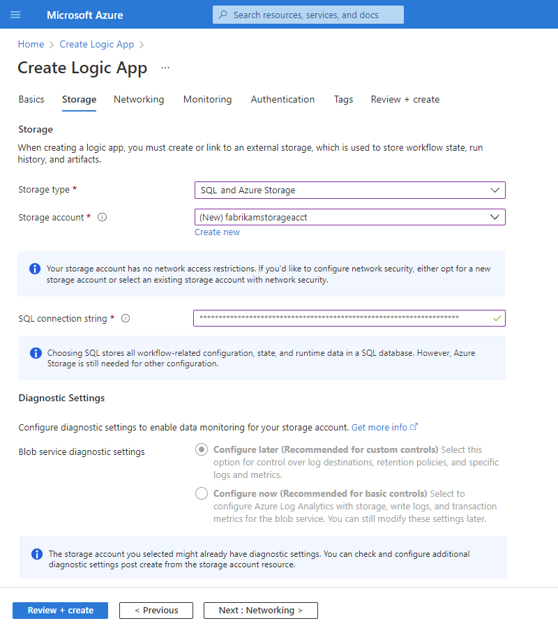10. Mantıksal uygulamanız için bir depolama hesabı seçmeniz istendiğinde aşağıdaki seçeneklerden birini belirleyin: