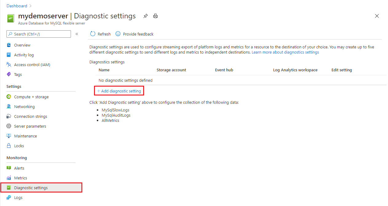 Yavaş sorgu günlükleri, günlüklerinizi üç veri havuzuna aktarmanıza olanak sağlamak için Azure İzleyici tanılama ayarlarıyla tümleştirilir: