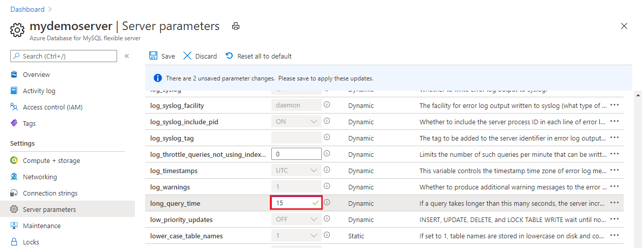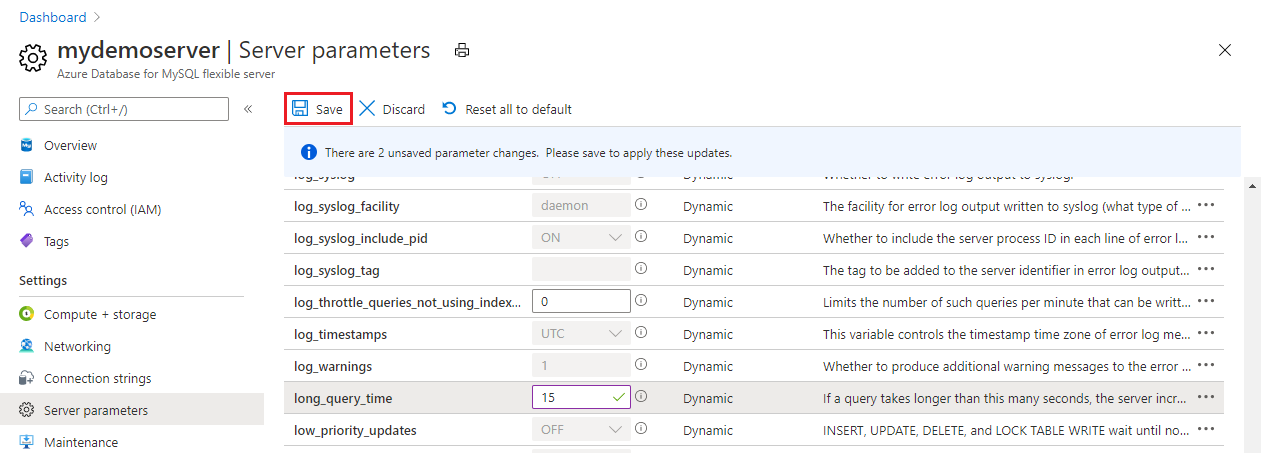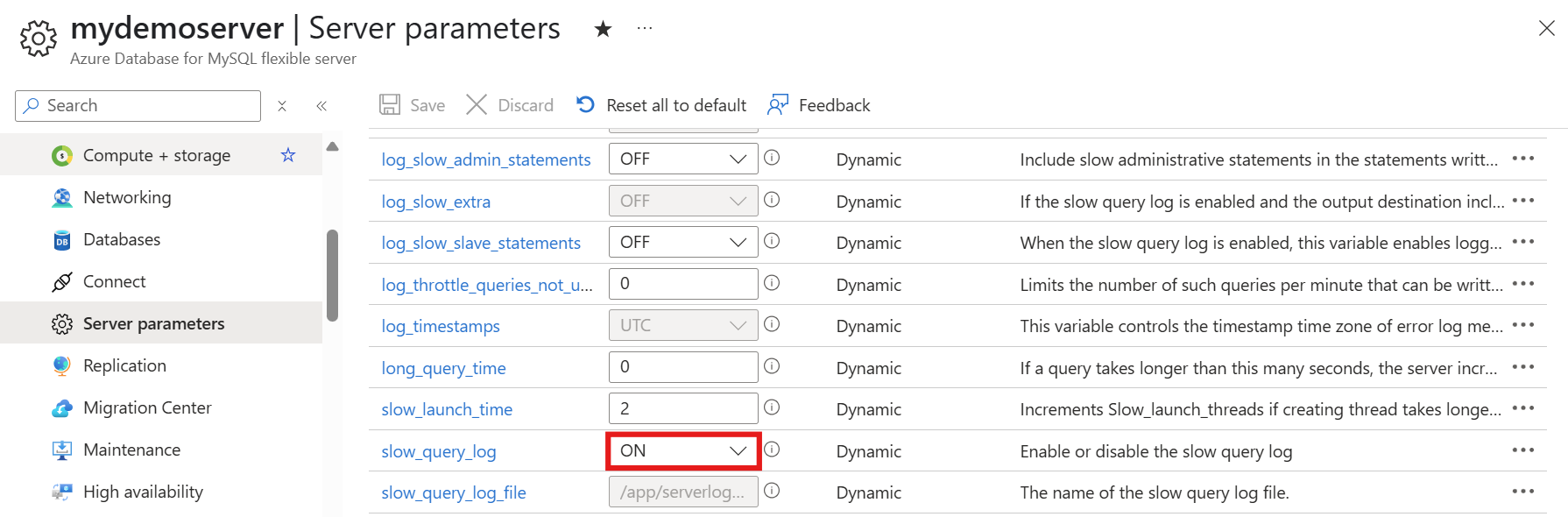 Alternatif olarak, aşağıdaki komutu çalıştırarak Azure CLI'dan MySQL için Azure Veritabanı Esnek Sunucu örneğiniz için yavaş sorgu günlüklerini etkinleştirebilir ve yapılandırabilirsiniz: