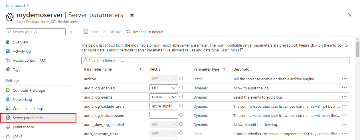 MySQL için Azure Veritabanı Esnek Sunucu örneğinizin performansının büyük ölçüde etkilenmediğinden emin olmak için yalnızca denetim amaçlarınız için gereken olay türlerini ve kullanıcıları günlüğe kaydetmenizi öneririz.