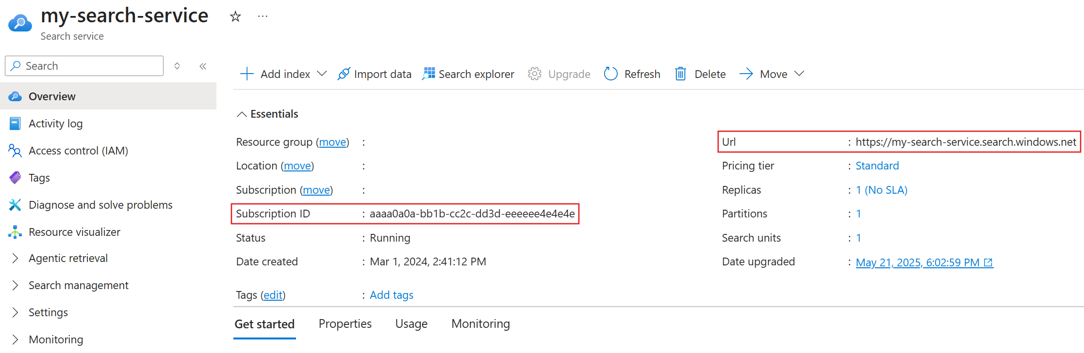 Bu bölümde Azure AI Search hizmetinizin abonelik kimliğini ve uç noktasını alırsınız. Yalnızca bir aboneliğiniz varsa abonelik kimliğini atlayın ve yalnızca uç noktayı alın. Bu değerleri bu hızlı başlangıcın kalan bölümlerinde kullanırsınız.