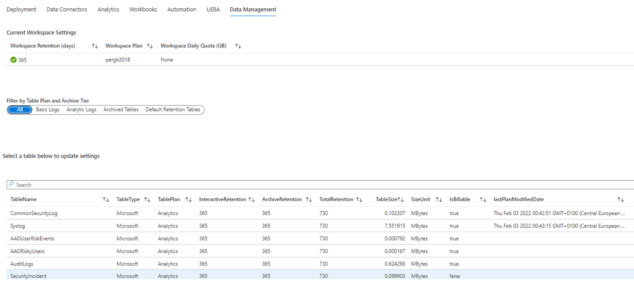 Microsoft Sentinel'i dağıtırken veya microsoft sentinel'e geçirirken, gelen günlüklerin kullanımını ve yaşam döngüsünü yönetmek önemlidir. Microsoft Sentinel Dağıtım ve Geçiş çalışma kitabında Veri Yönetimi'ni seçerek tablo saklamayı ve arşivlemeyi görüntüleyin ve yapılandırın.