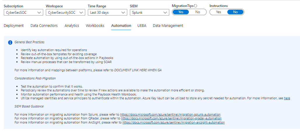 Dağıtım ve geçiş işlemine yardımcı olmak için çalışma kitabı, farklı sekmelerin nasıl kullanılacağını açıklayan ipuçları ve ilgili kaynaklara bağlantılar içerir. İpuçları Microsoft Sentinel geçiş belgelerine dayanır ve geçerli SIEM'inizle ilgilidir. İpuçlarını ve yönergeleri etkinleştirmek için , Microsoft Sentinel Dağıtım ve Geçiş çalışma kitabında, sağ üstteki Geçiş İpuçları ve Yönerge'yiEvet olarak ayarlayın.