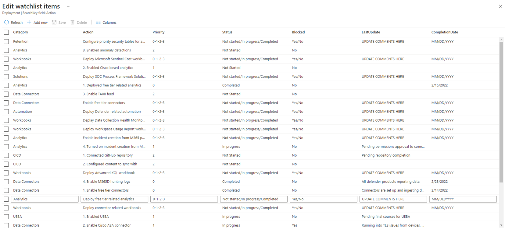 Kuruluşunuzun güvenlik operasyonları merkezi (SOC) artan miktarda veriyi işlediğinden, dağıtım durumunuzu planlamak ve izlemek çok önemlidir. Microsoft Project, Microsoft Excel, Microsoft Teams veya Azure DevOps gibi genel araçları kullanarak geçiş işleminizi izleyebilirsiniz ancak bu araçlar güvenlik bilgilerine ve olay yönetimine (SIEM) özgü değildir. İzlemenize yardımcı olmak için Microsoft Sentinel'de Microsoft Sentinel Dağıtımı ve Geçişi adlı ayrılmış bir çalışma kitabı sağlıyoruz.