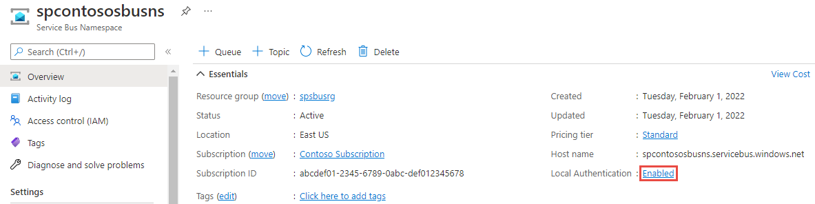 Aşağıdaki Azure Resource Manager şablonunda gösterildiği gibi özelliğini true olarak ayarlayarak disableLocalAuth Service Bus ad alanı için yerel kimlik doğrulamasını devre dışı bırakabilirsiniz.