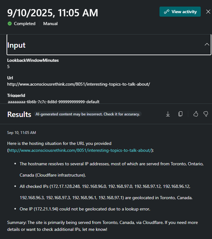 ExtractHostname: Uses the GPT toolExtractHostname_DCA-090925to parse the hostname from the URL.GetDnsResolutionsByIndicators: Uses the Microsoft Threat Intelligence skillset to retrieve the IP addresses associated with the hostname. Ensure thatRequiredSkillsets: ThreatIntelligence.DTImust be added without whichGetDnsResolutionsByIndicatorstool is not invoked.lookupIpAddressGeolocation: Is theoperationIdin the OpenAPI specification, which is referenced in the API pluginDCA_SampleAPIPluginto look up geolocation data for each IP address. For reference, see Build API sample.