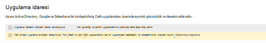 OAuth uygulamaları sekmesi Microsoft 365, Google çalışma alanı ve Salesforce'a görünürlük sağlar. Yöneticiler uygulamaları gözden geçirebilir ve uygulamaları devre dışı bırakmaya veya ortamlarındaki davranışlarını izlemek için ilkeler uygulamaya karar verebilir.