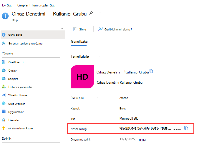 Sid, Microsoft Entra grupları için Nesne Kimliği değerini kullanır. Nesne Kimliği değerini Microsoft Entra portalındaki grup özelliklerinden bulabilirsiniz.
